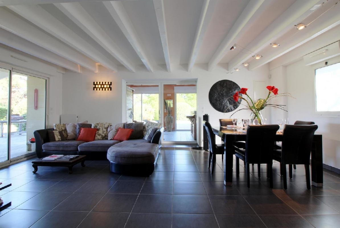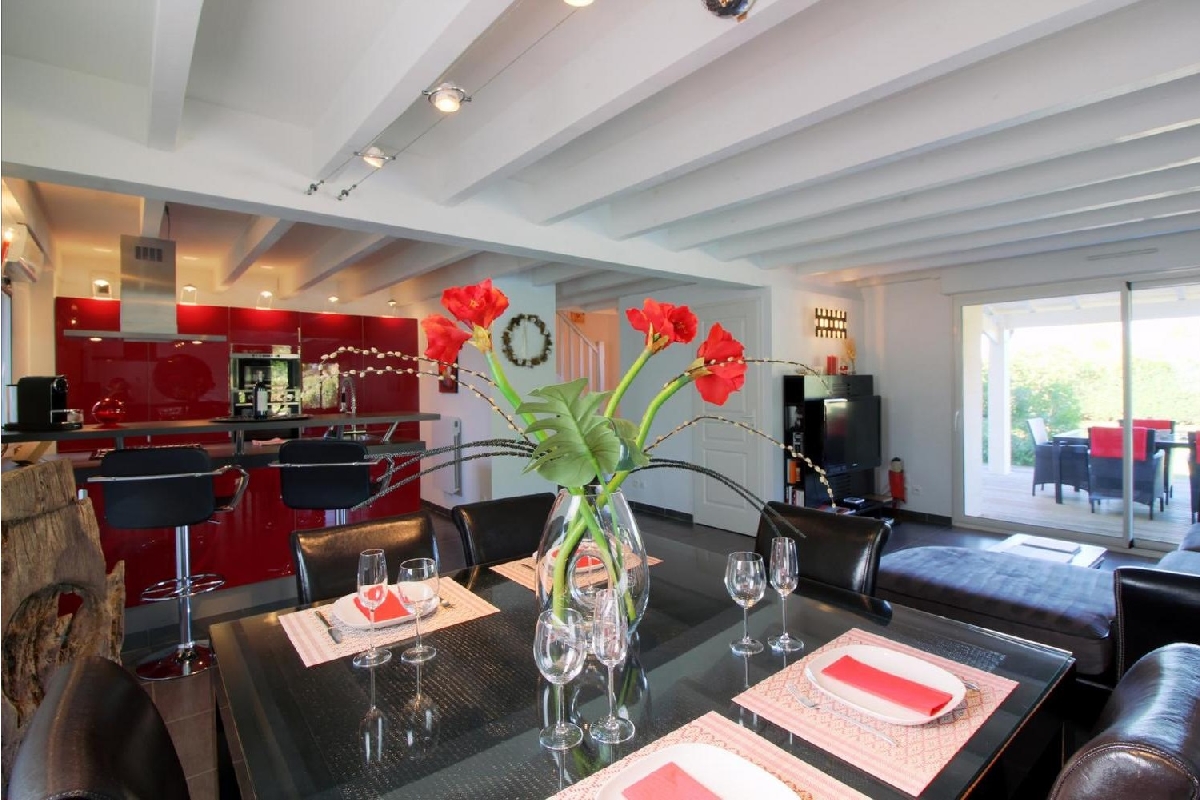 Votre maison de vacances, d'une superficie de 135m2, est composée d'une grande pièce de vie, au rez-de chaussé, avec une cuisine américaine entièrement équipée "comme à la maison", une salle à manger, un salon avec un grand canapé d'angle, TV écran plat, DVD, station d'accueil FM bluetooth. En continuté de l'espace de vie et à usage exclusif, vous pourrez vous détendre dans l'Espace Balnéo comprenant un Jacuzzi haut de gamme avec une eau à 37° toute l'année et un Sauna en bois d'epicéa finlandais de la marque Clairazur, ainsi qu'une douche à l'italienne. Un célier avec machine à laver. Un wc avec lave mains.