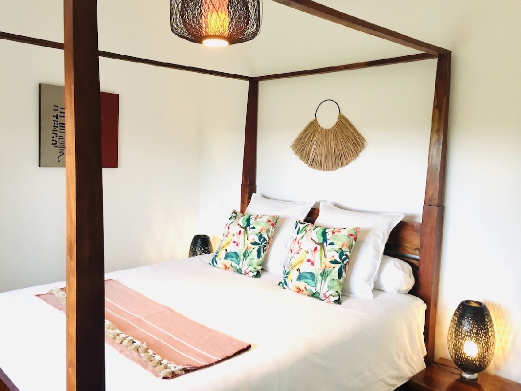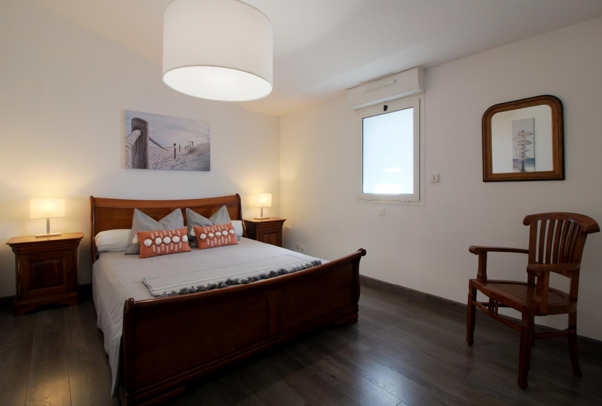Pouvant acceuillir jusqu'à 4 personnes (6 max.) , elle dispose à l'étage de 2 chambres doubles, avec possibilité d'ajouter un lit simple et/ou un lit bébé (sur demande lors de la réservation), d'une grande salle de bains et un wc séparé avec lave mains.